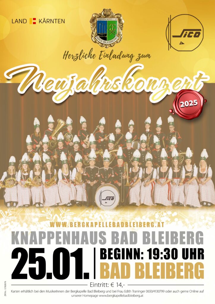 Wir wünschen euch einen guten Rutsch ins neue Jahr 2025 …… mit viel Glück und vor allem Gesundheit.Wir starten musikalisch mit unserem Neujahrskonzert …… und freuen uns auf euer Kommen!Samstag, 25. Jänner 2025 im Knappenhaus Bad Bleiberg Tickets um 14 € erhältlich per E-Mail:mario_glantschnig@gmx.atoder auch gerne telefonisch:+43 676 480 4949oder perFormular Bitte aktiviere JavaScript in deinem Browser, um dieses Formular fertigzustellen.Bitte aktiviere JavaScript in deinem Browser, um dieses Formular fertigzustellen.Name *VornameNachnameTelefonnummer * Anzahl die E-Mail-Adresse E-Mail-Adresse *Anzahl Eintrittskarten ? Gewählter Wert: 0 Wie möchten Sie die Eintrittskarten erhalten ?per WhatsAppper EmailAbsenden